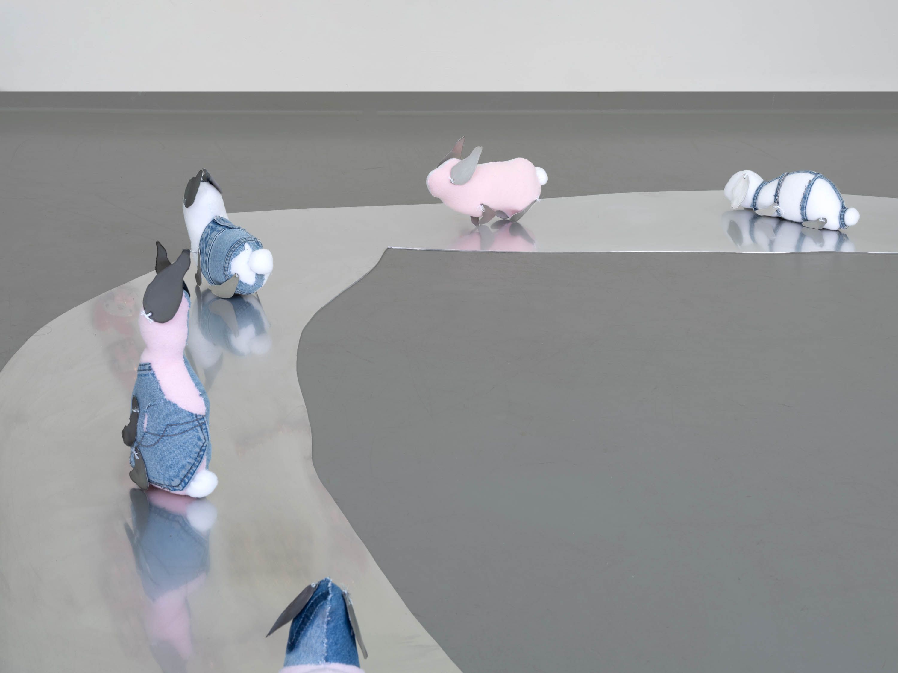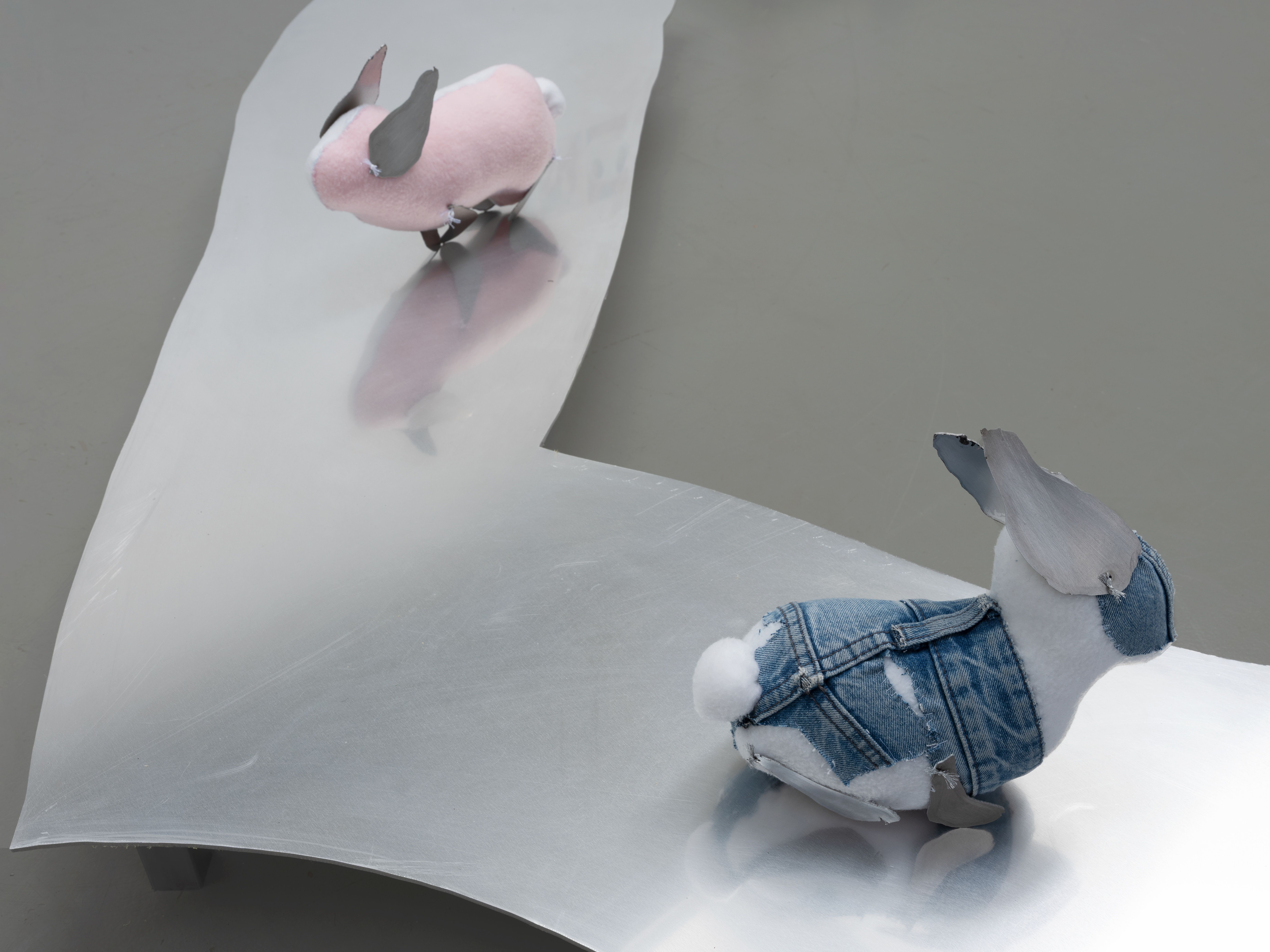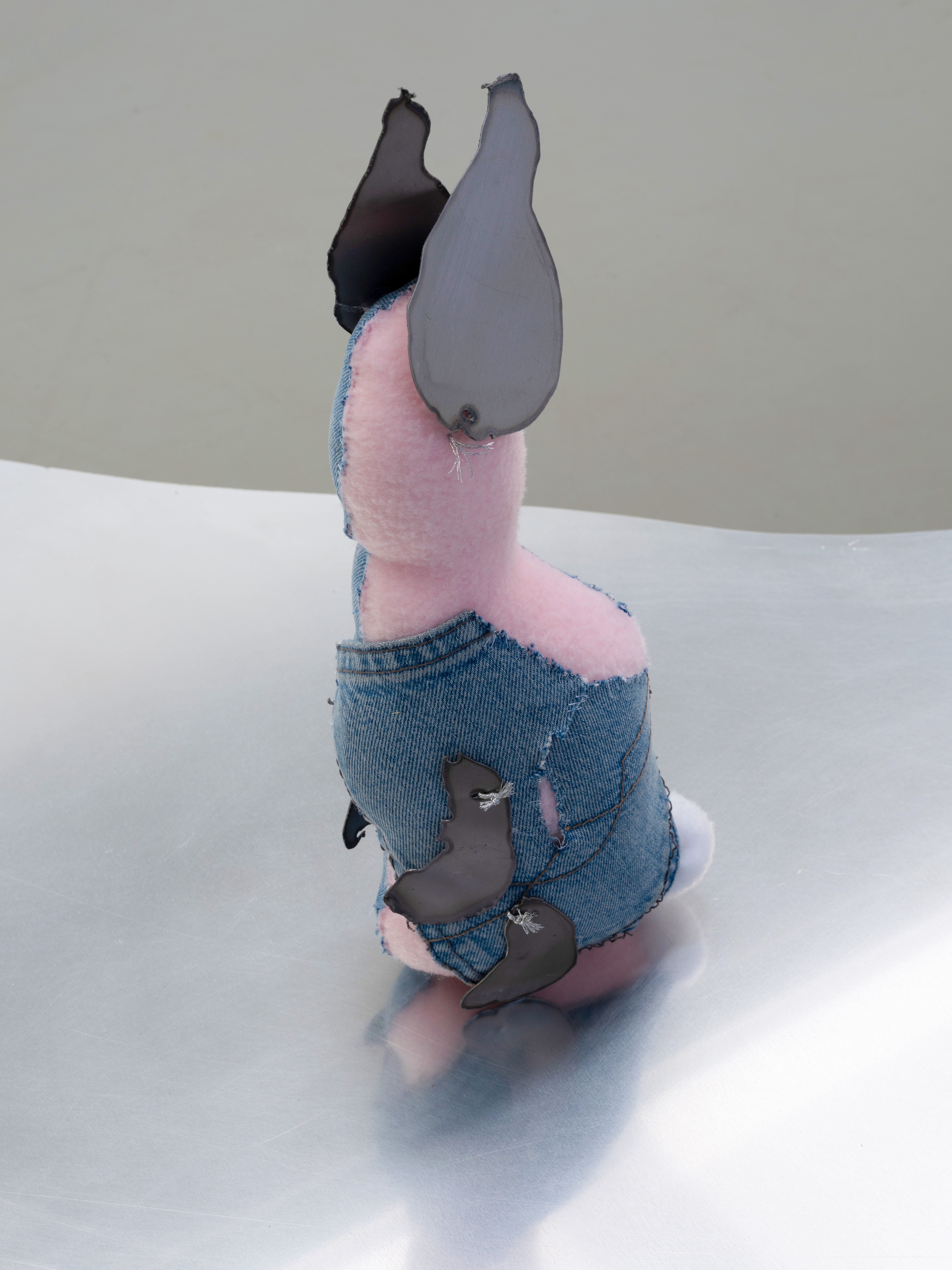 fabric bunnies, denim, brass, denim, aluminum.