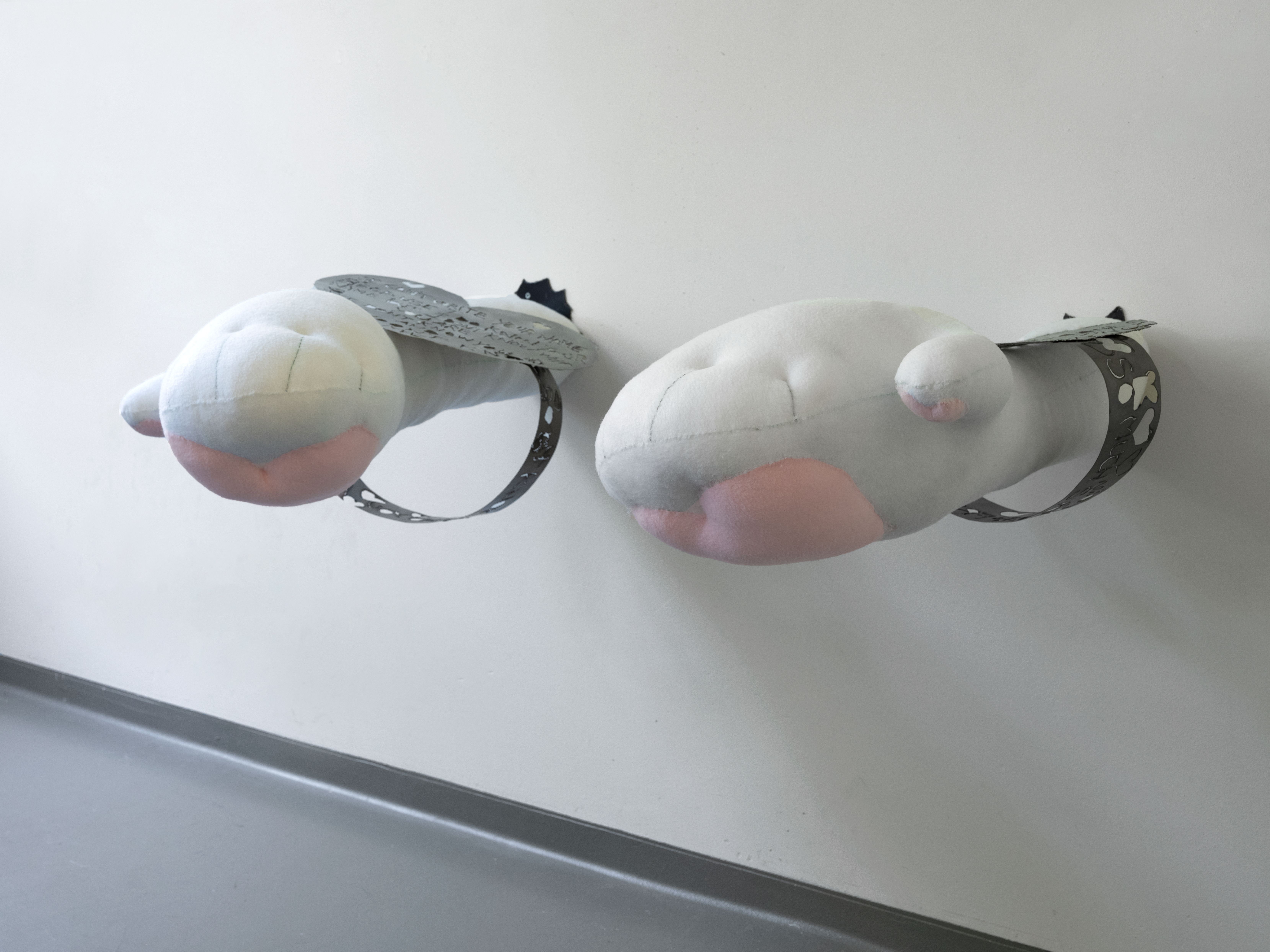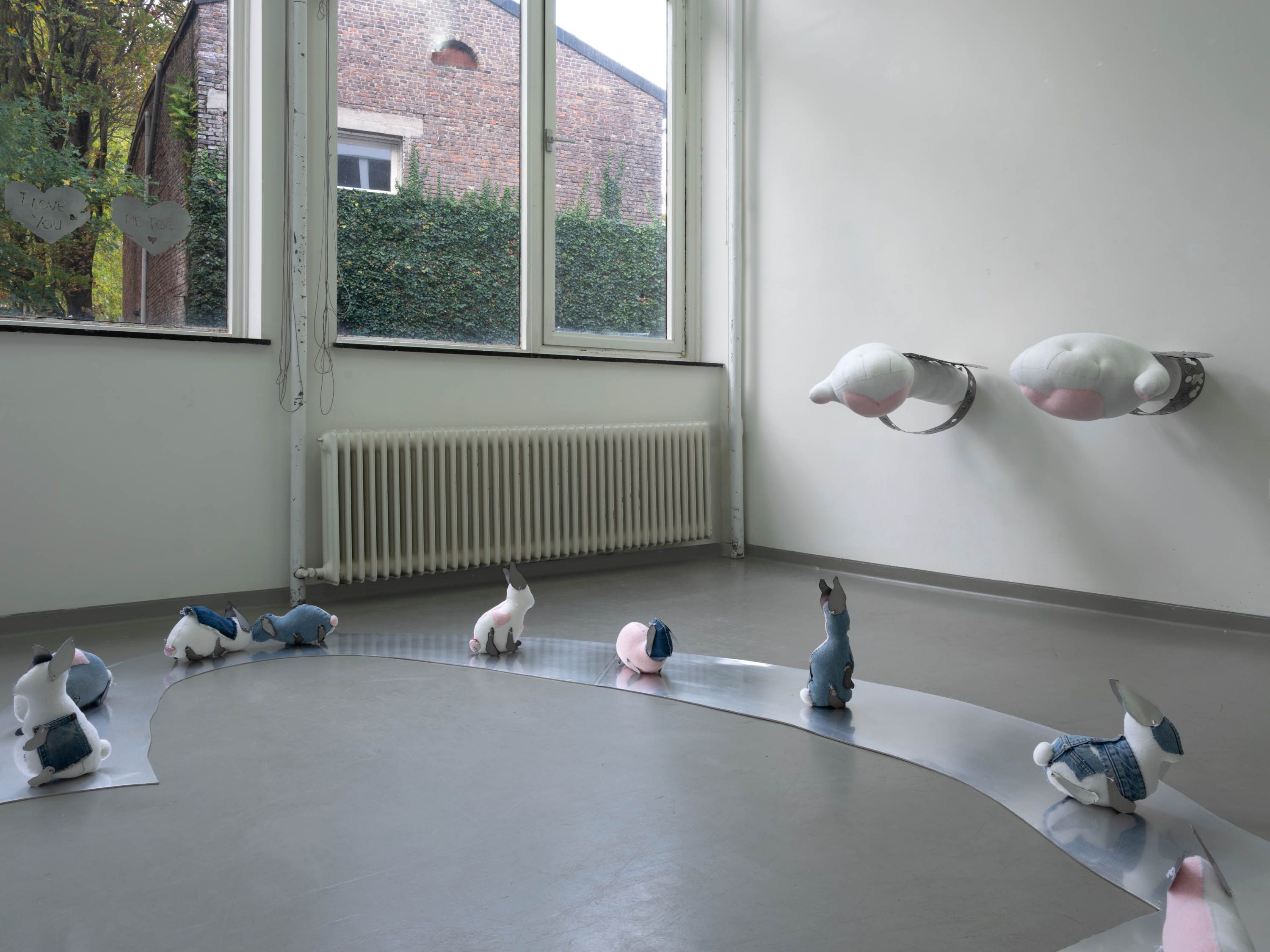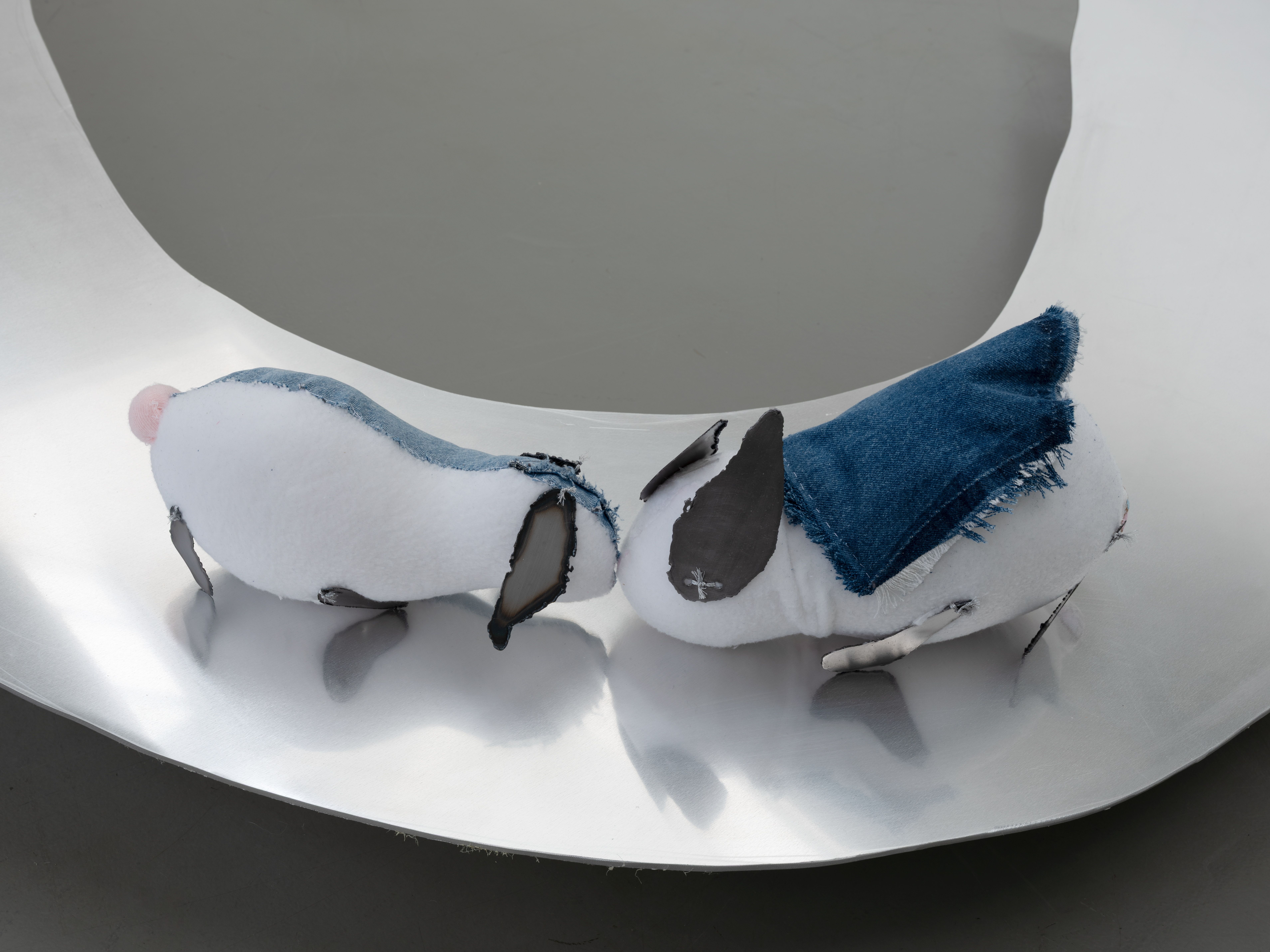 fabric bunnies, denim, brass, denim, aluminum.