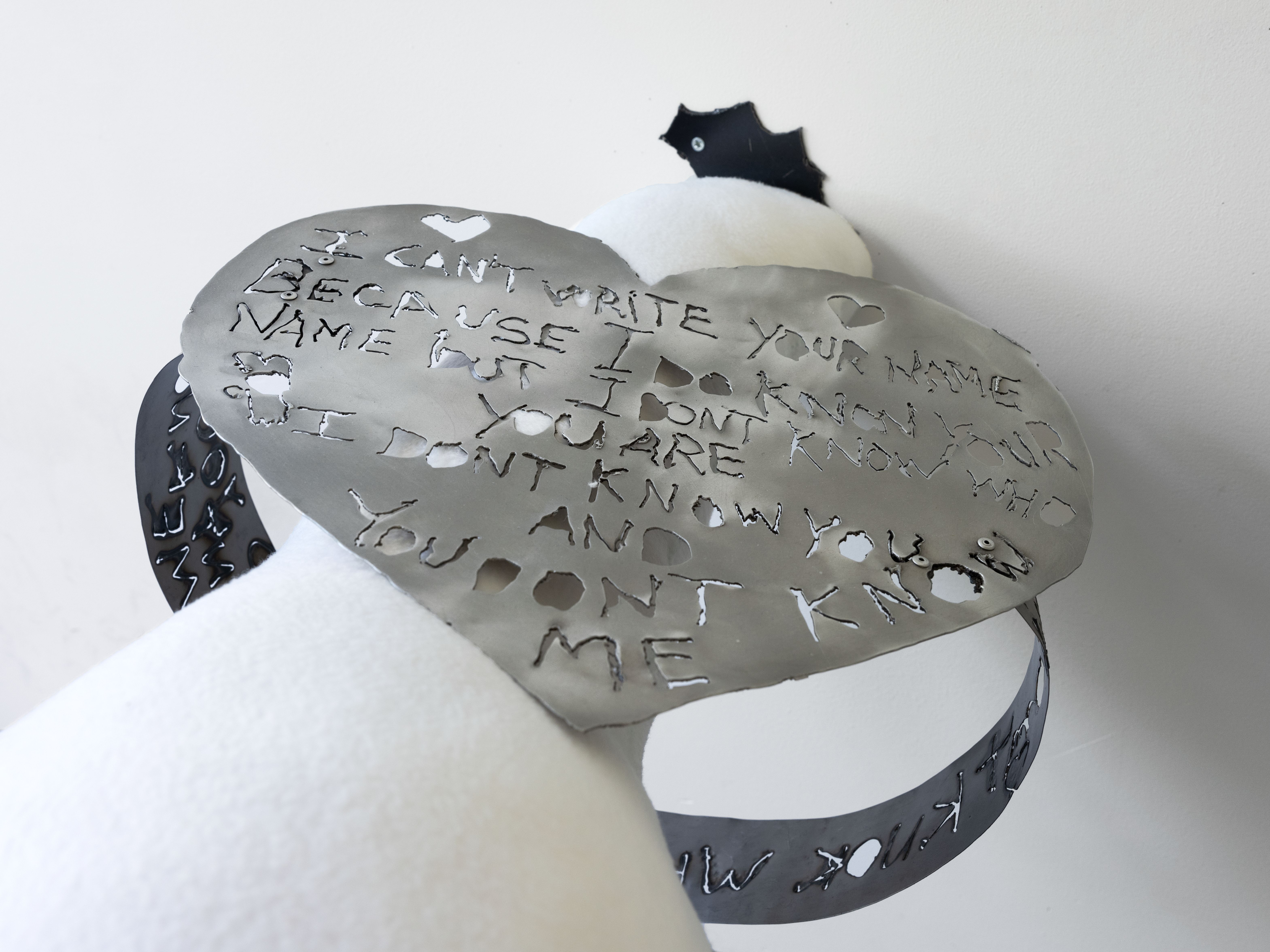 Fabric, metal frame, plasma-cut aluminum and brass.